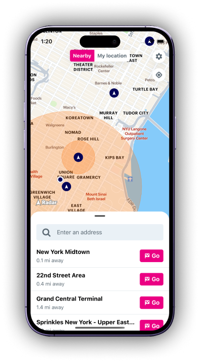You can use our Radar Waypoint apps for iOS and Android to test Radar before integrating the SDK, or to test your implementation of Radar side-by-side with a complete implementation.